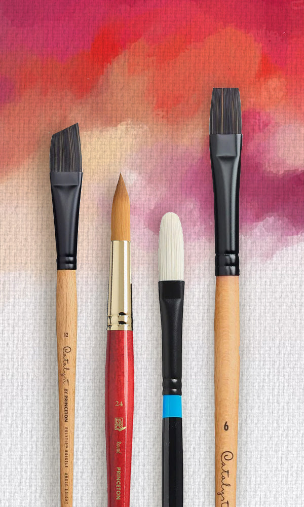 Watercolour brushes are designed for working with watercolour paints. These brushes are typically made with soft and absorbent natural hair, such as squirrel or sable hair, allowing them to hold and release water and paint effectively. Watercolour brushes come in various shapes, including round, flat, mop, and more, offering versatility in creating washes, details, and delicate lines.