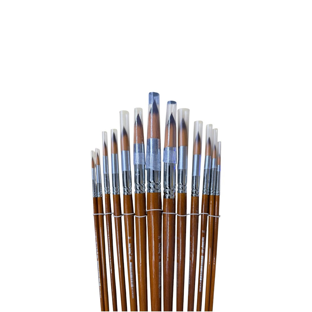 Watercolour brushes are designed for working with watercolour paints. These brushes are typically made with soft and absorbent natural hair, such as squirrel or sable hair, allowing them to hold and release water and paint effectively. Watercolour brushes come in various shapes, including round, flat, mop, and more, offering versatility in creating washes, details, and delicate lines.
