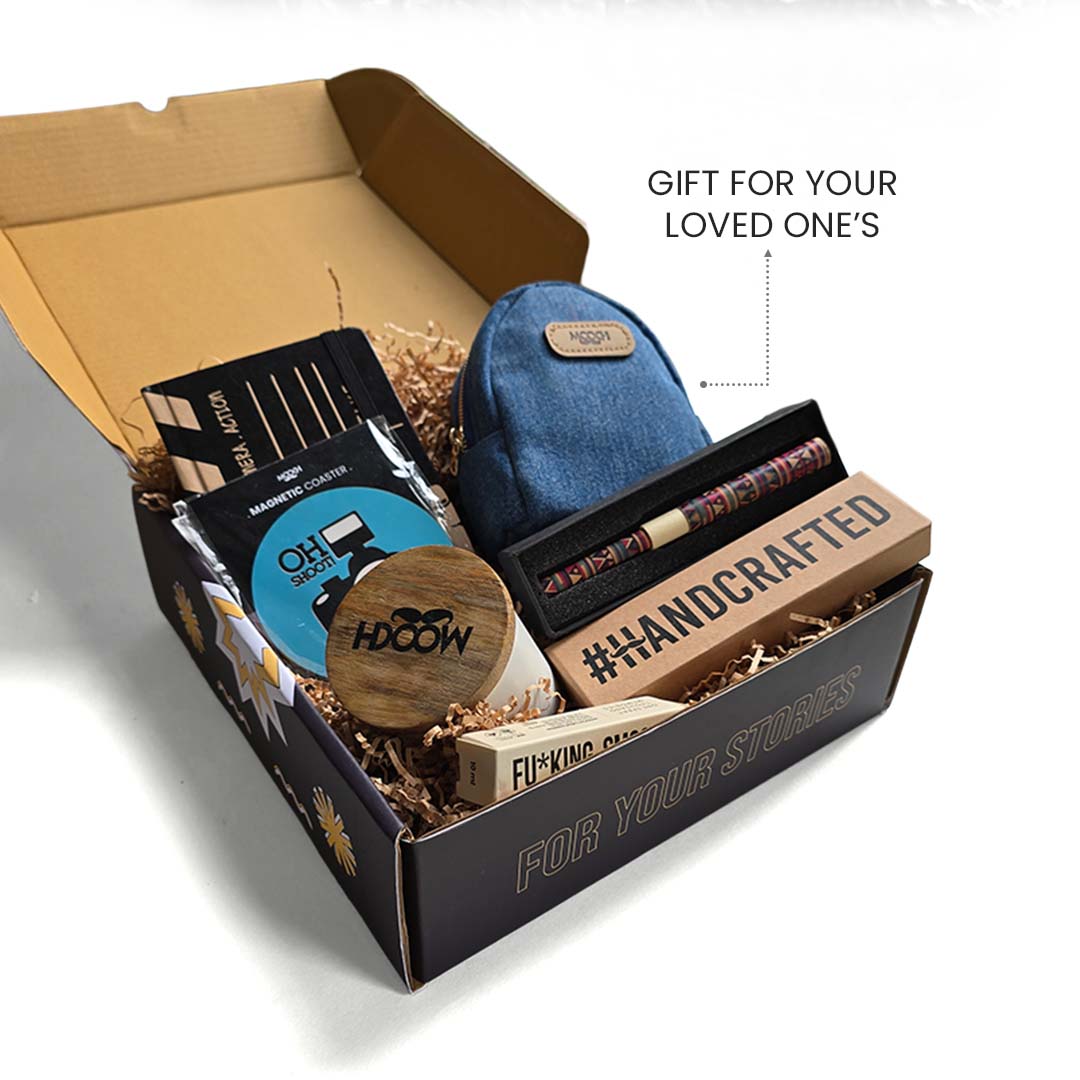 • Unique Stationery: Doodle diaries, combo boxes, tech organizers, denim pouches, magnetic coasters and badges, candles, fragrances, and curated gift sets.