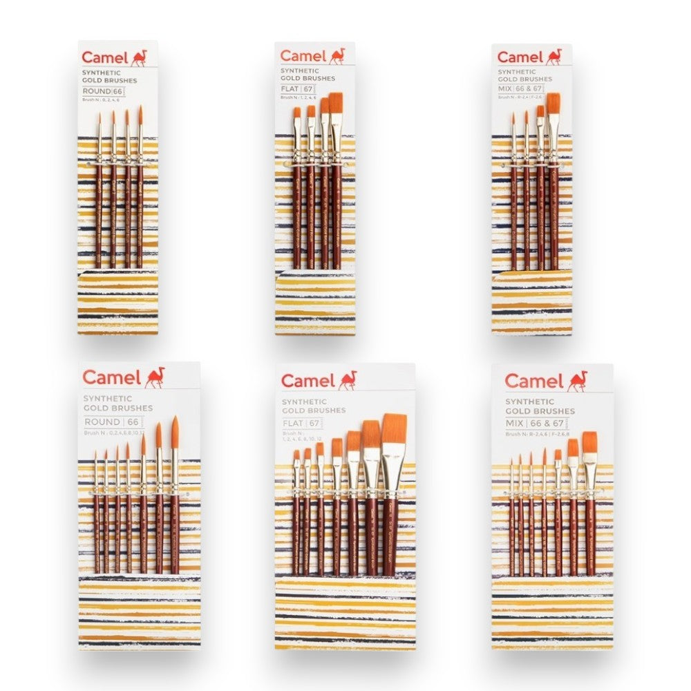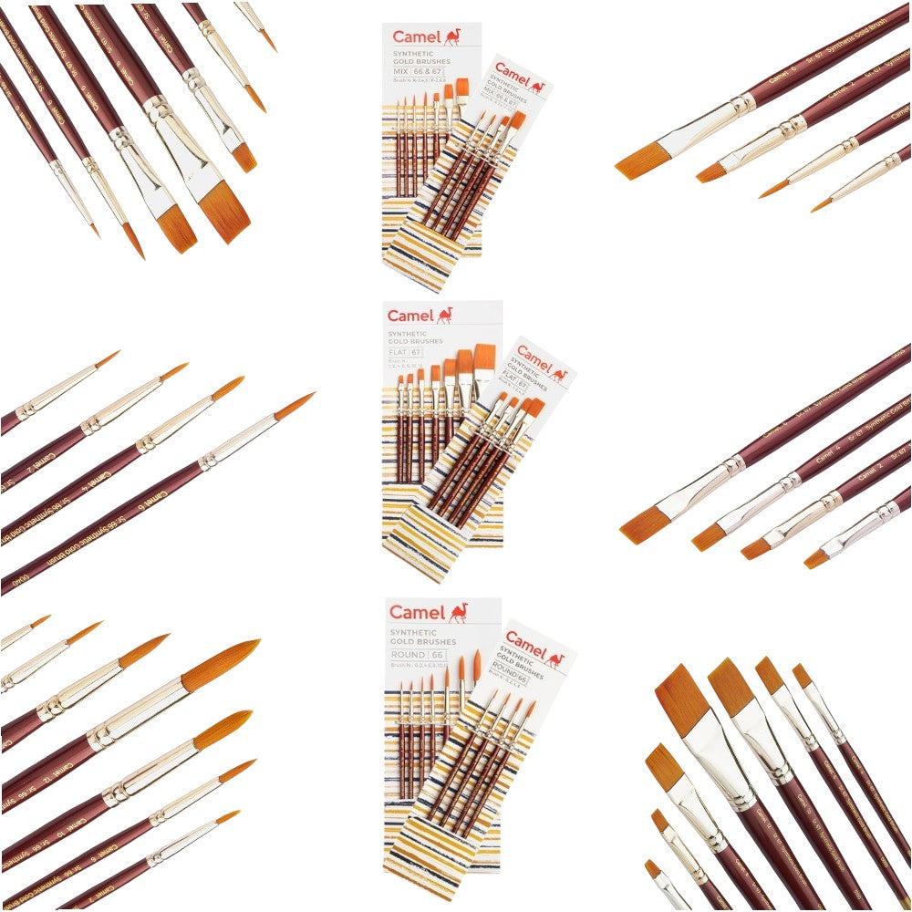 - Camel Camlin synthetic paint brush sets ( 66, 67, 68, 69 series) for artists are best for Water, Acrylic, and Poster Colouring. This brush is versatile and is an amalgamation of a round and flat brush. It allows a smooth blending of colours and creates perfect strokes. They have white bristle brushes also for oil painting.